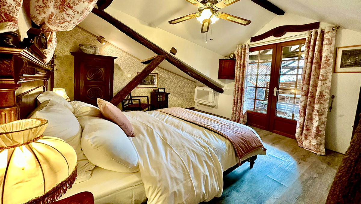 Chambre Climatisée pour 2 personnes, située au dernier étage de la maison. Poutres apparentes, terrasse privative. Salle de douche privative avec toilettes.