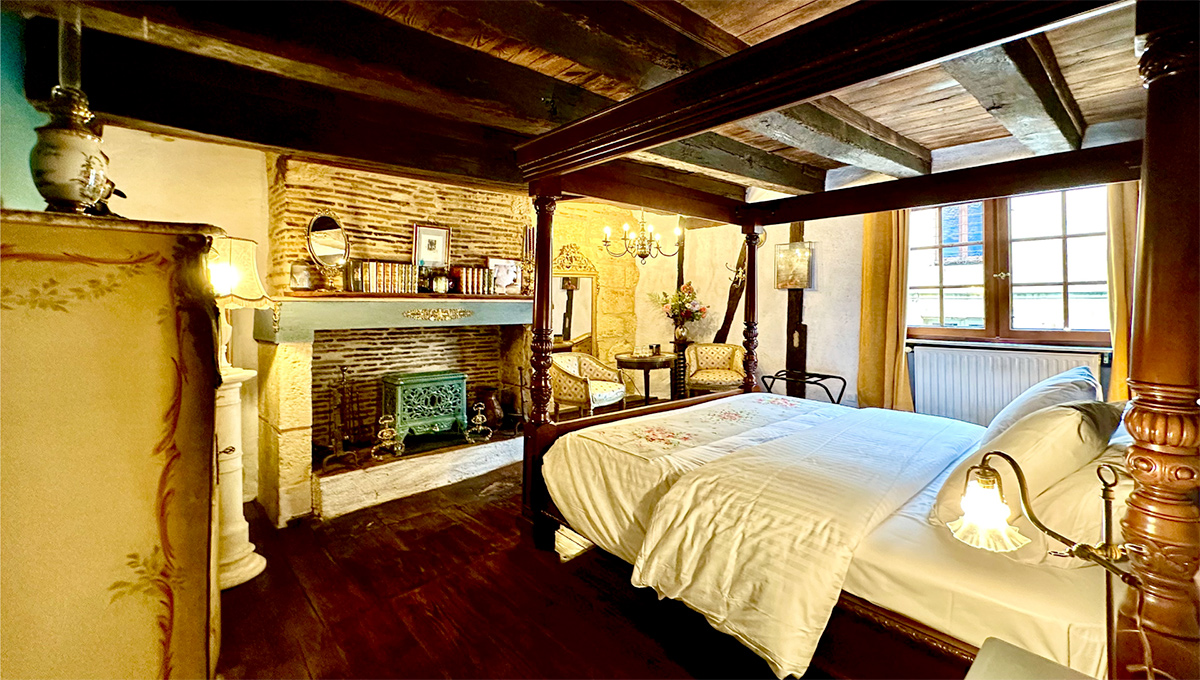 Air-conditioned room for 2 people, located on the 1st floor, overlooking a quiet street. Exposed beams, spacious with a reading area. Bathroom and separate toilet. Beautiful king-size four-poster bed.