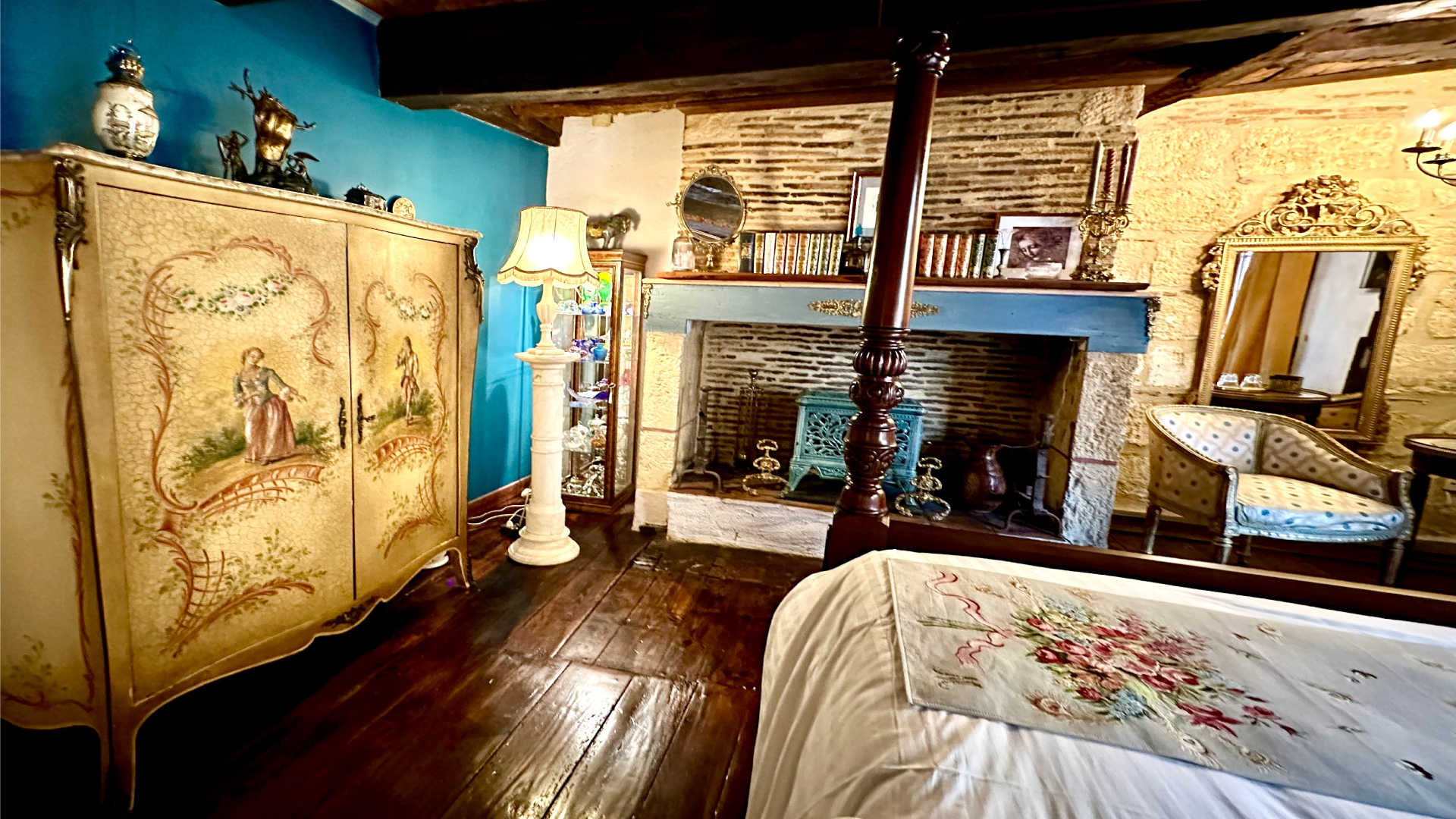 Air-conditioned room for 2 people, located on the 1st floor, overlooking a quiet street. Exposed beams, spacious with a reading area. Bathroom and separate toilet. Beautiful king-size four-poster bed.